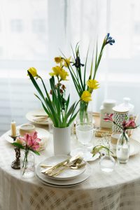 Inget säger ”vår” mer än fräscha blommor och naturliga inslag. Plocka in kvistar av björkris, blåbärsris eller vitsippor och placera dem i små vaser. En krispig bukett tulpaner på bordet är nästan ett måste, men även minivaser med krokusar eller snödroppar kan göra stor skillnad. Vill du gå ett steg längre? Skapa en påskkrans att hänga på dörren eller lägga som en mittpunkt på bordet!